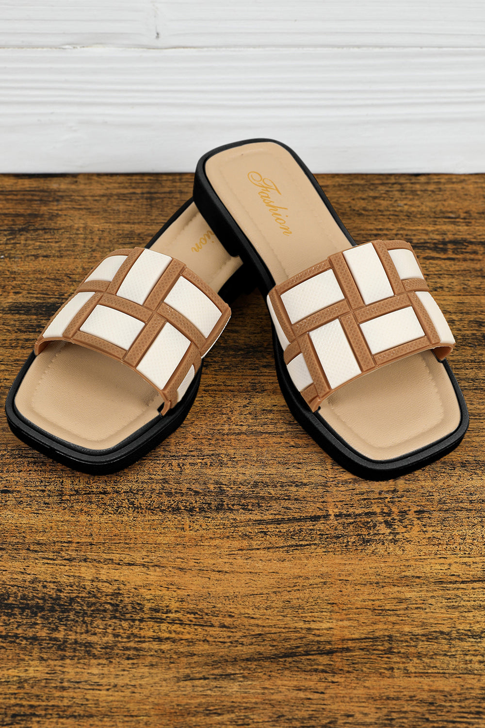 Beige Two Tone Contrast PU Leather Square Toe Slippers