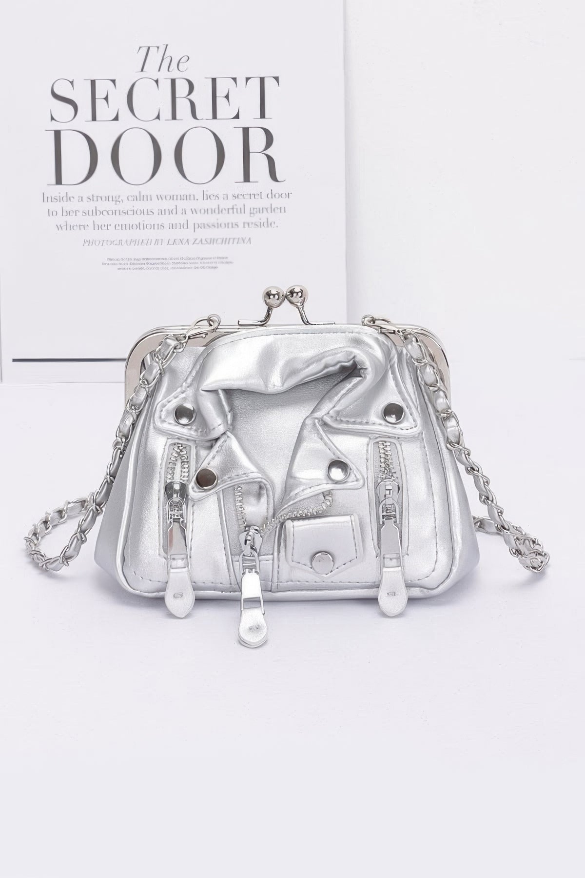 Design: Features a unique jacket-style design with a zipper detail and mixed metal hardware for an added touch of sophistication and style.