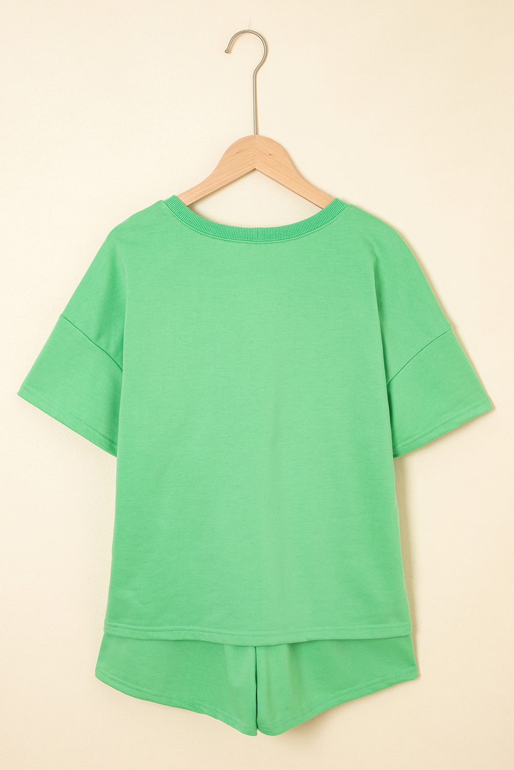 Mint Green V Neck Drop Shoulder Tee and Patchwork Drawstring Shorts Set