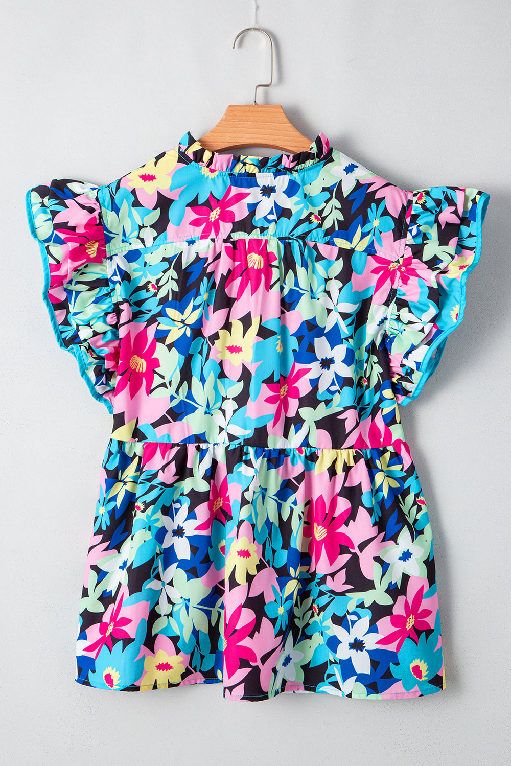Blue Floral Flutter Sleeve Tied Notched Neck Plus Size Blouse
