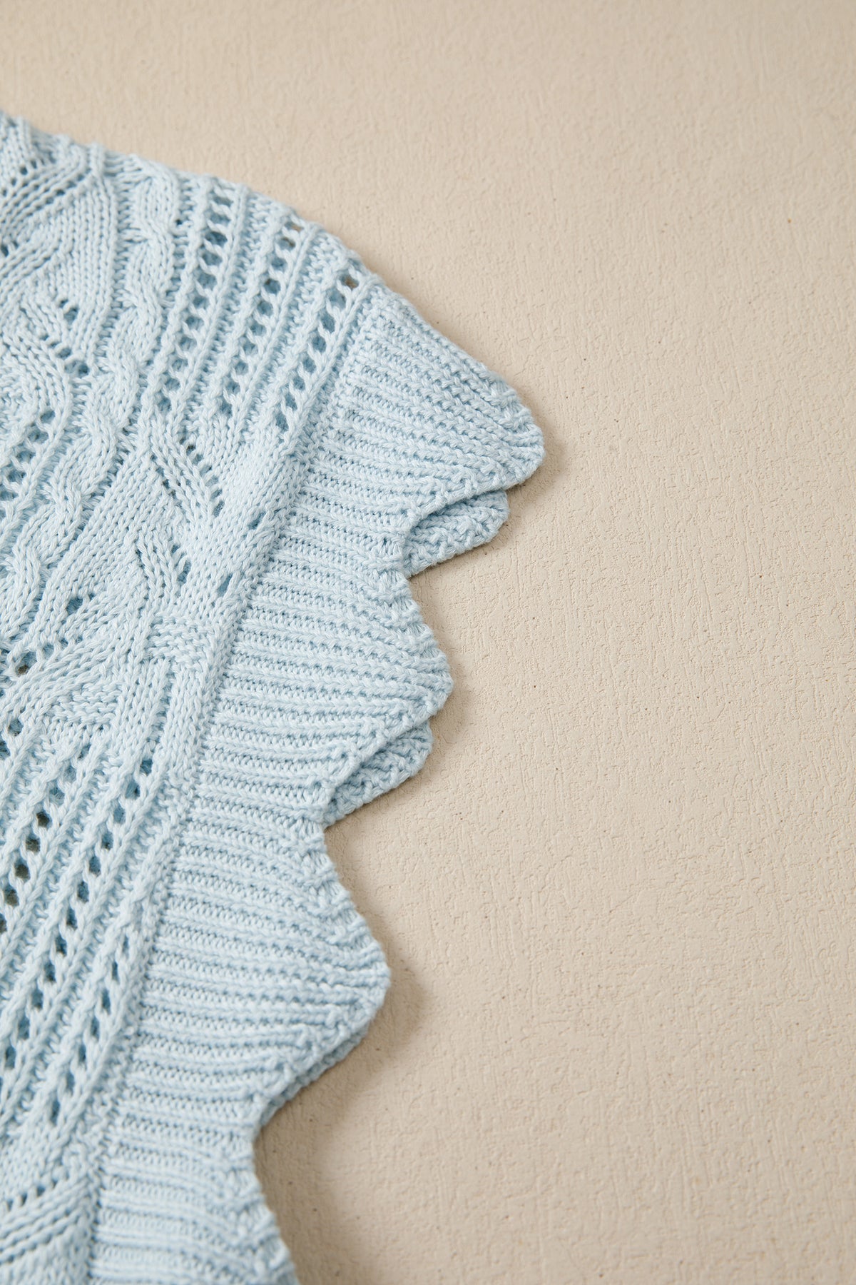 Beau Blue Pointelle Knit Patterned Scalloped Trim Short Sleeve Sweater
