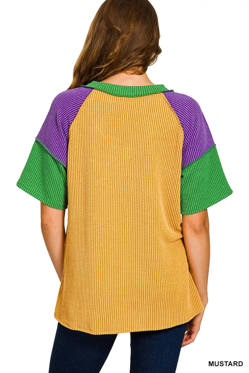 Zenana Mardi Gras Raised Rib Color Block Top