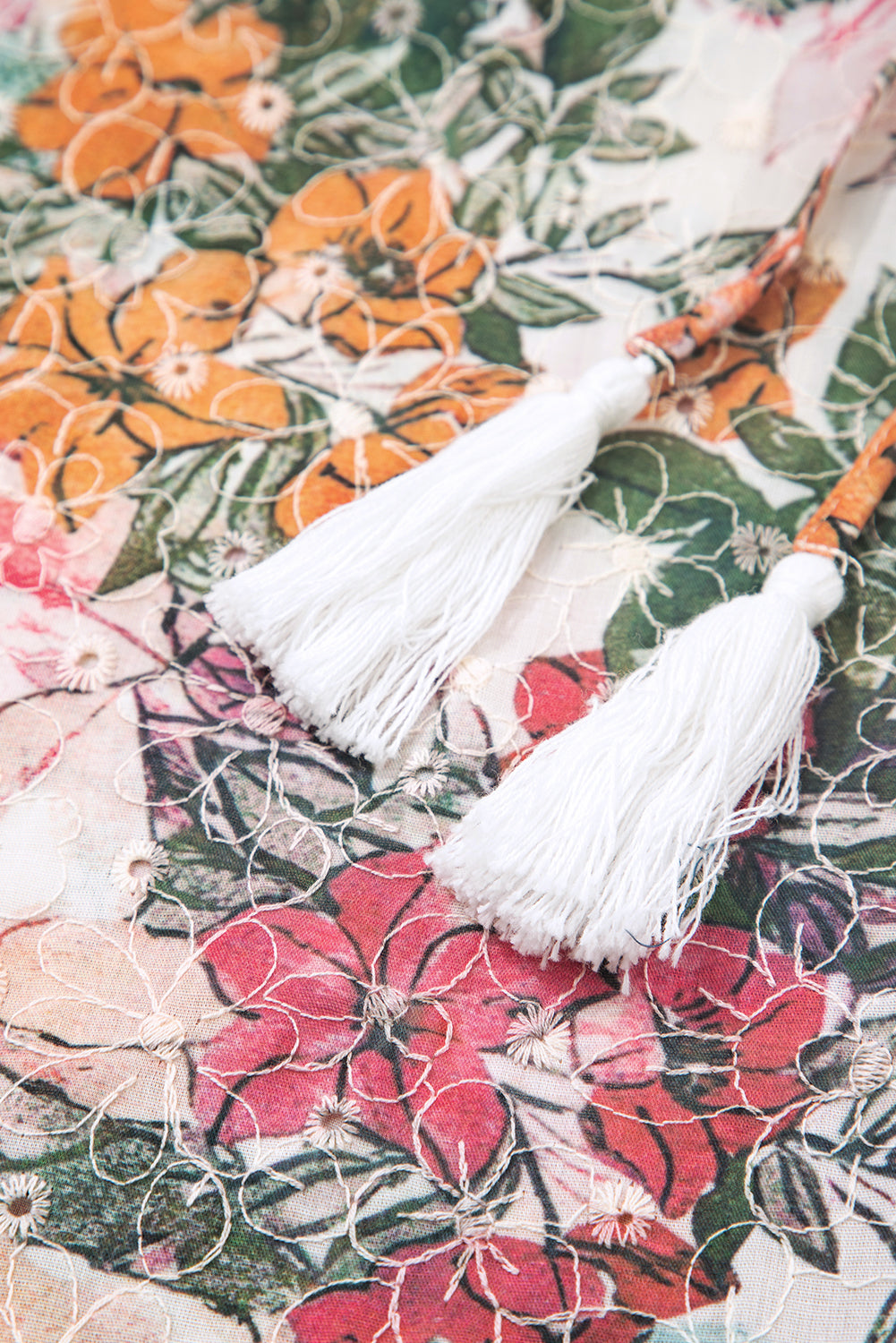 It has a split neck with ties, full length sleeves with elastic cuff.