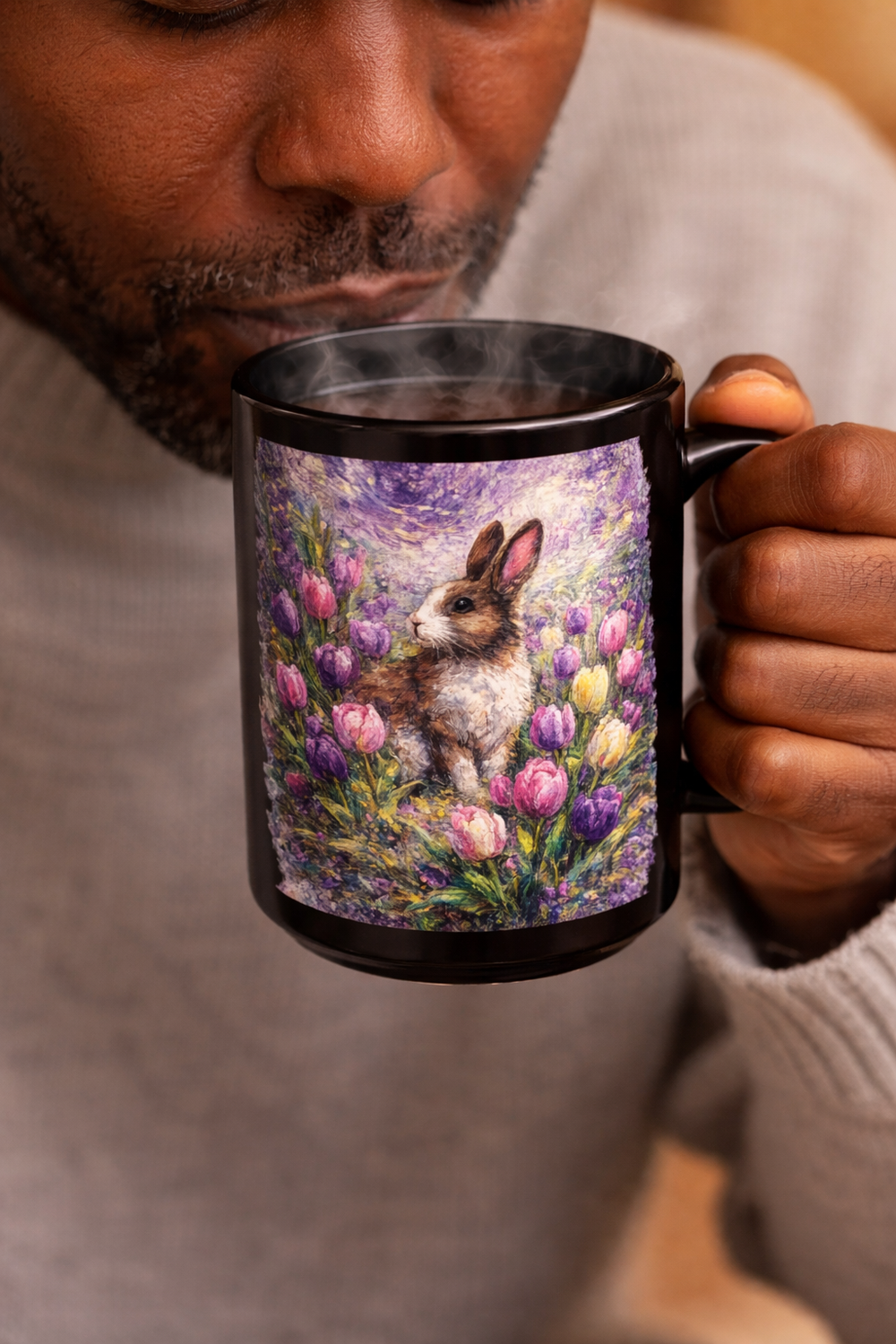 Floral Bunny Illustration Mug | Black Ceramic 15oz