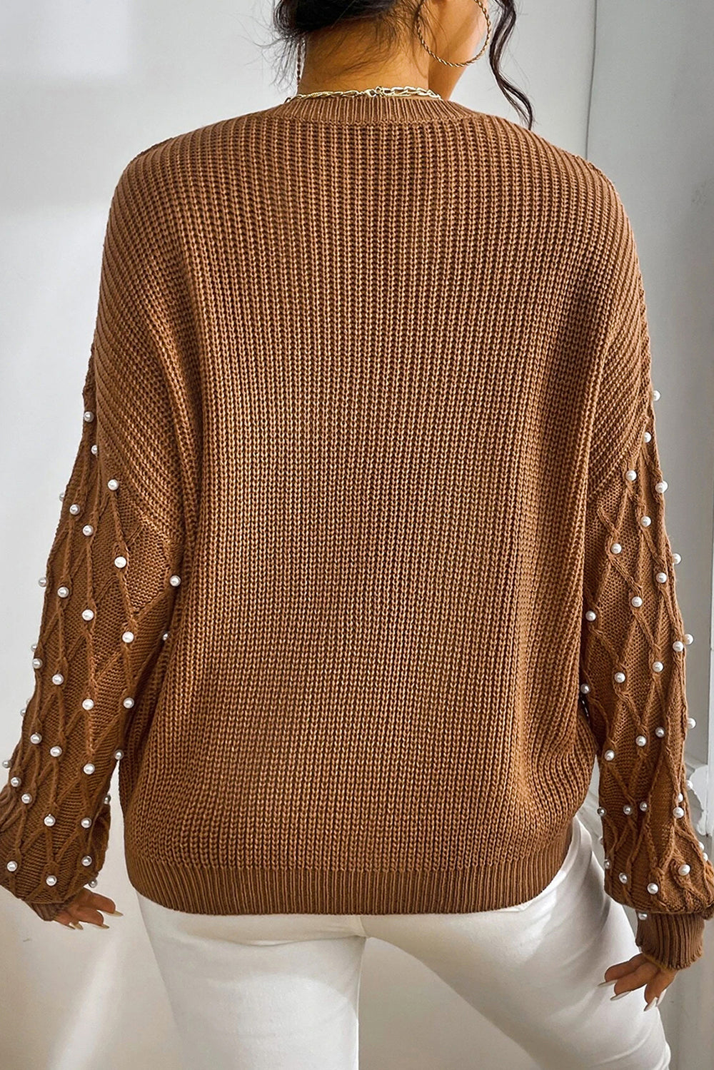 Pull col rond à épaules tombantes et perles châtain