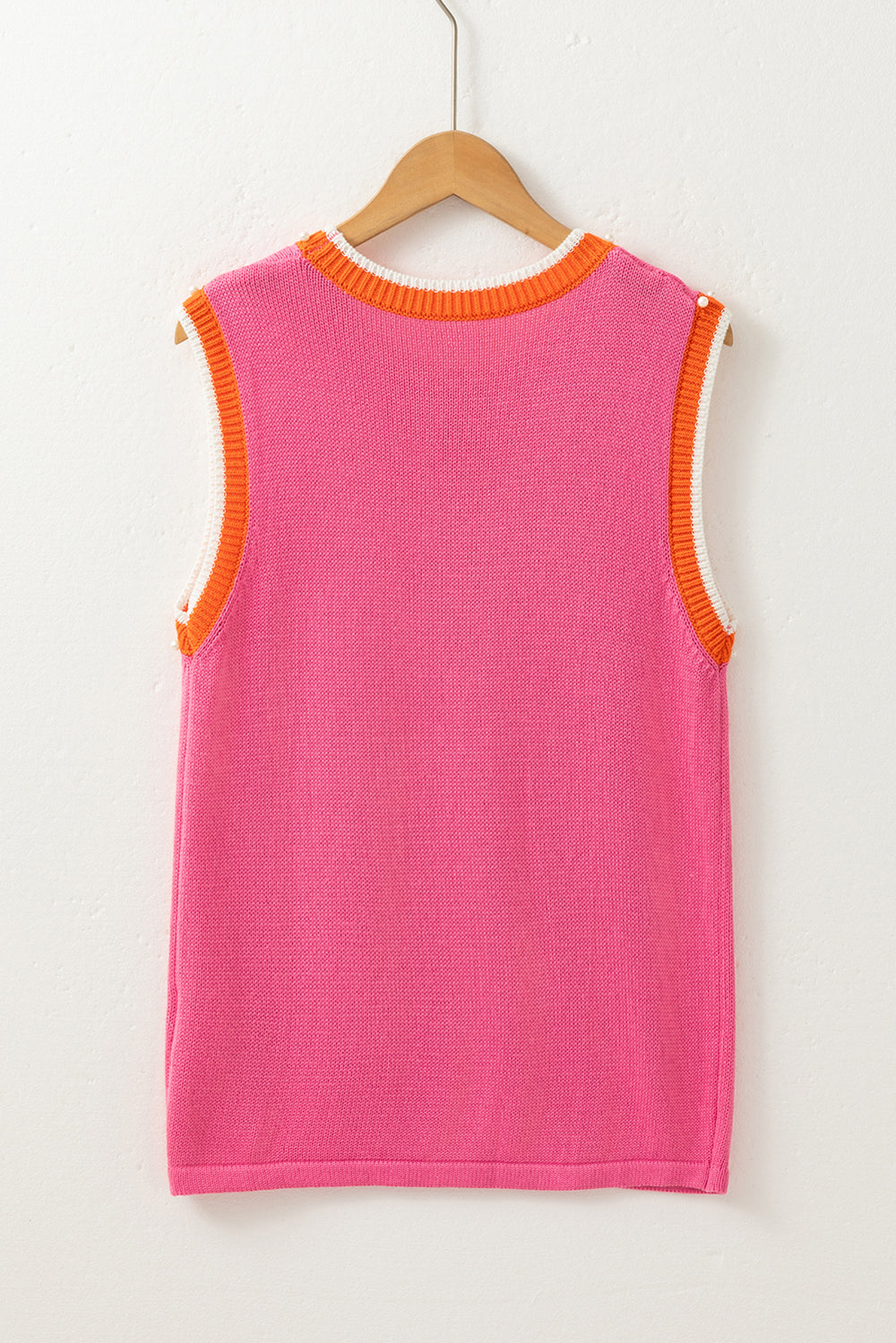 Bright Pink Contrast Trim Pearl Detail Sweater Tank Top