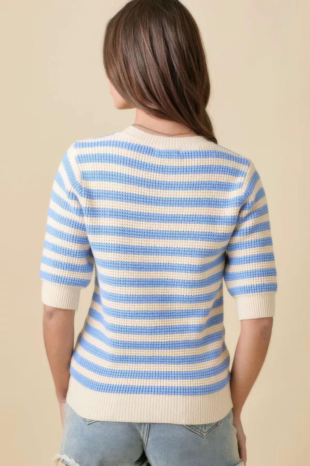 Product Description: The Short Sleeve Sweater Knit Stripe Top offers a perfect balance of comfort and style. Made from a soft and stretchy blend of 95% polyester and 5% spandex, this top features a classic stripe pattern that adds a modern, timeless look. The sweater knit construction ensures a cozy feel, while the short sleeves make it versatile enough for transitional weather. Whether paired with jeans for a casual outing or layered under a jacket for a polished ensemble, this top brings effortless charm to your wardrobe.
