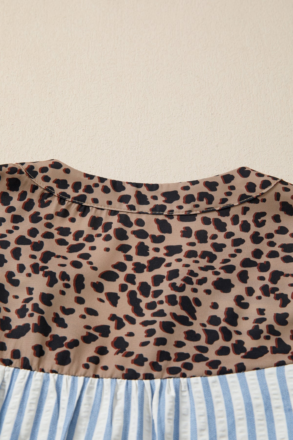 Trendy striped V neck shirt with chic leopard trim detail for bold contrast. Button down front and half sleeves create an easy, flattering silhouette. Breathable lightweight fabric keeps you cool and comfy all day long. Perfect casual shirt to style with jeans, skirts, or tailored pants.