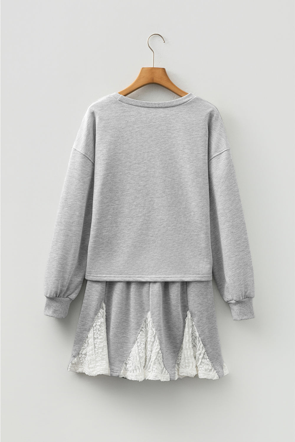 Light Grey Lace Patchwork Drop Shoulder Pullover Drawstring Skort 2pcs Outfit