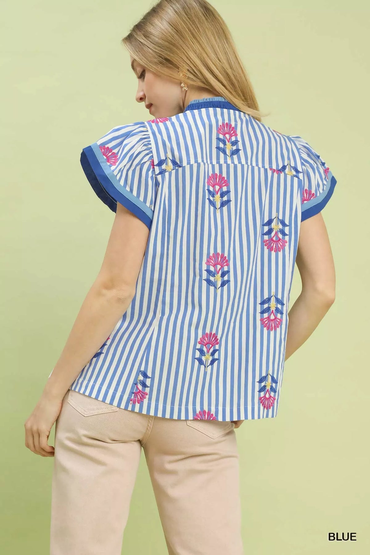 The Embroidered Striped Flutter Sleeve Top features intricate floral embroidery that adds a delicate and feminine touch to the design. It includes a stylish split V-neck detail that enhances the overall look. The flutter sleeves offer a breezy and chic silhouette, perfect for a relaxed and stylish outfit. The color block contrast adds a modern and eye-catching element to the top. Please note that this top is not lined, providing a lightweight and comfortable feel for all-day wear.