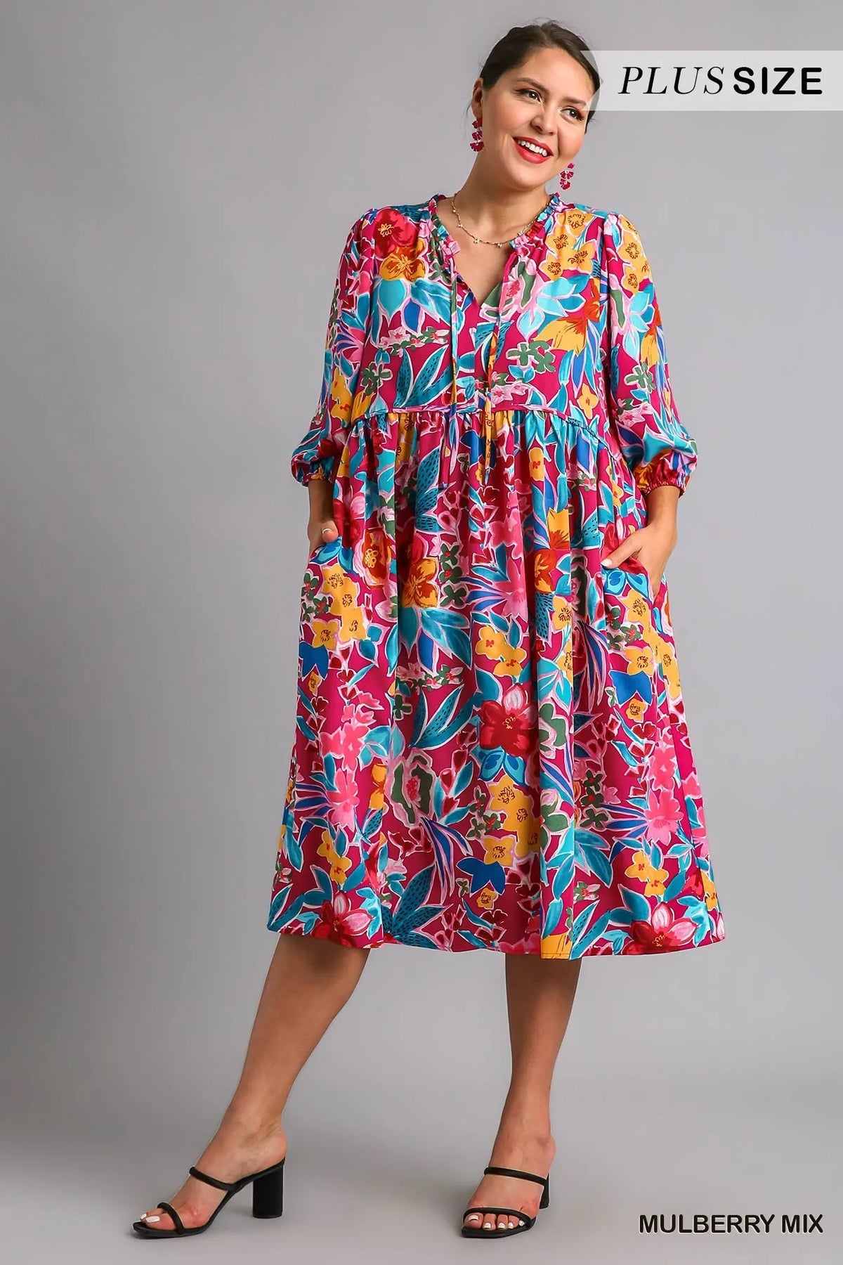 Umgee Full Size Floral Print Tie Neck Midi Dress with Pockets Plus Size
