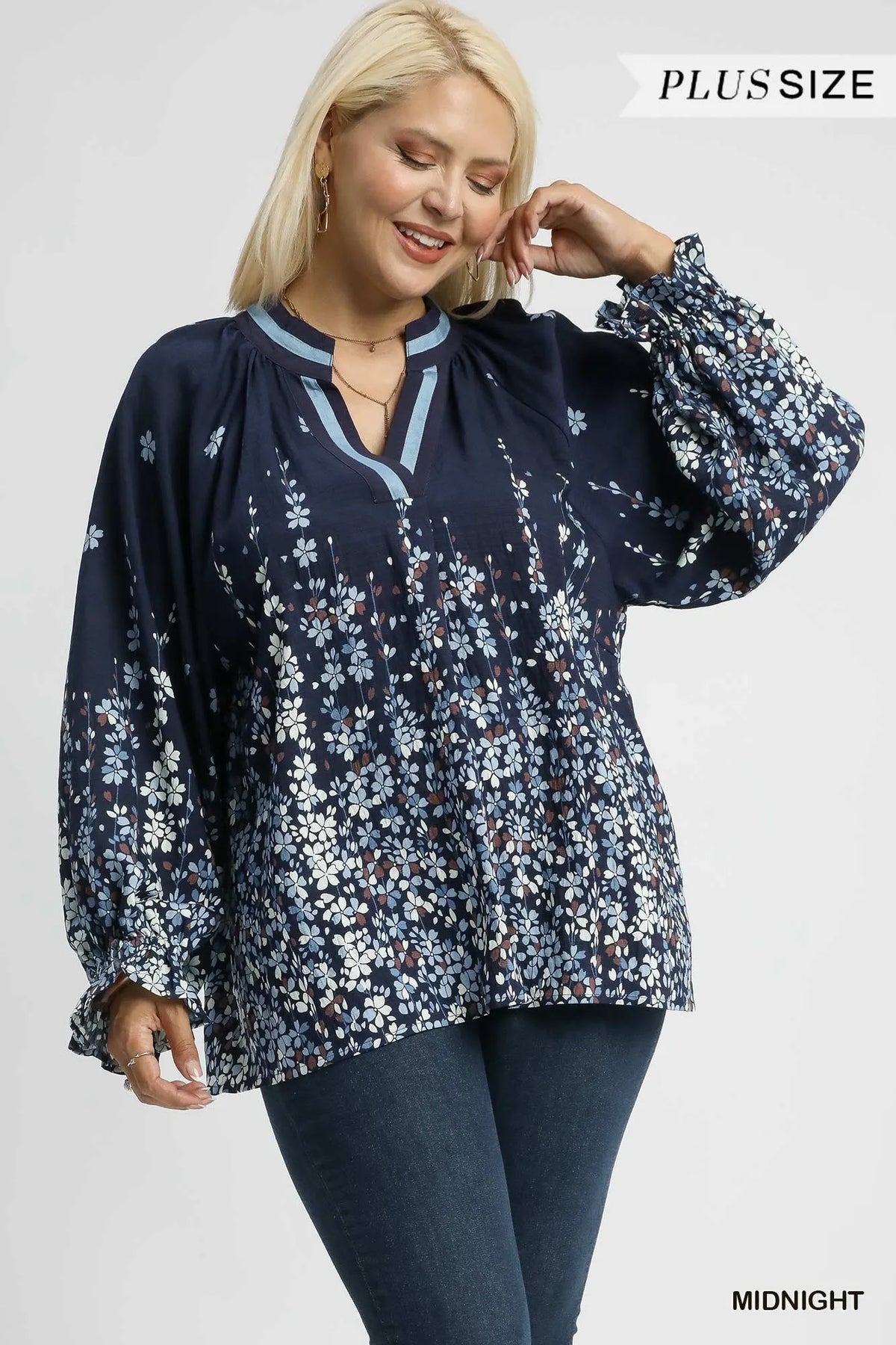 Umgee Full Size Floral Vine Print Blouse with Balloon Sleeves Plus Size
