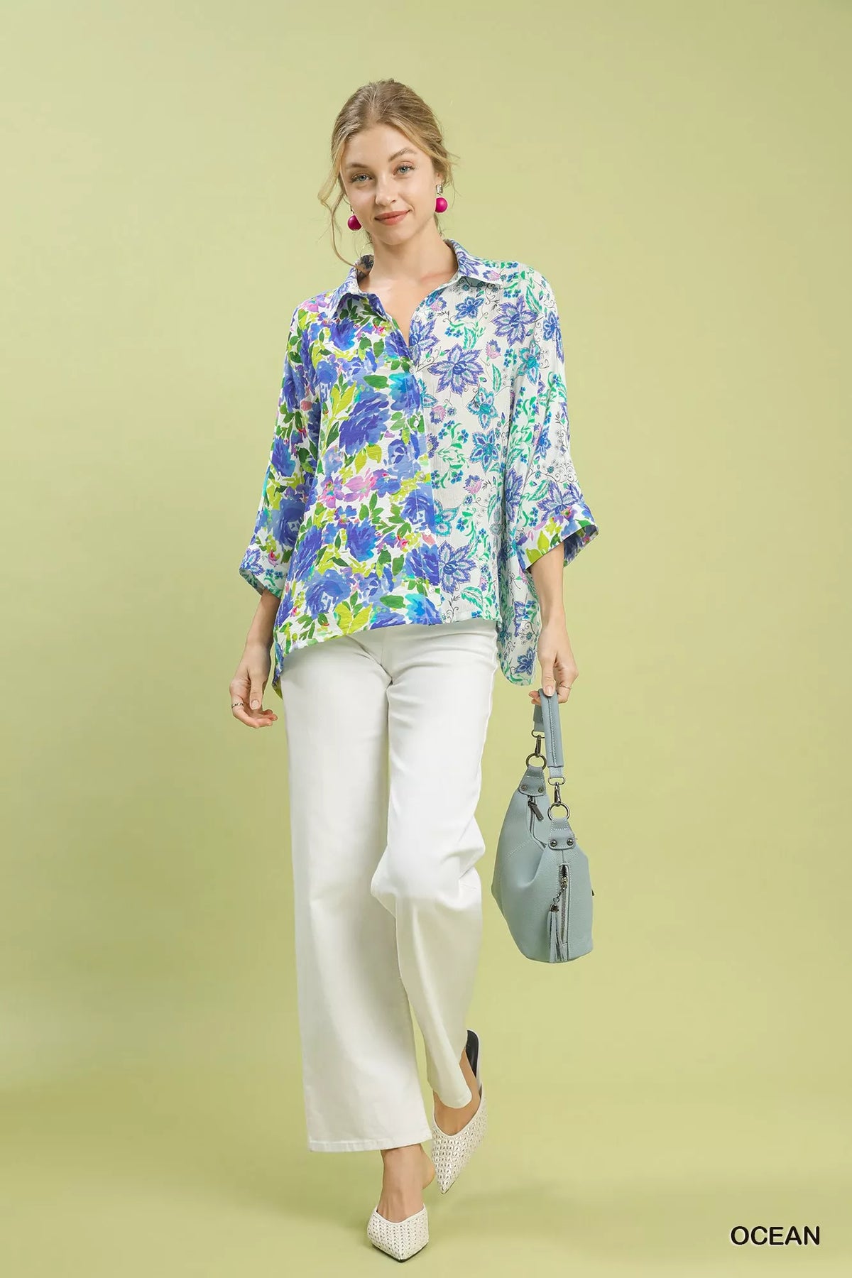 This Mixed Floral Oversized Button Down Top offers a relaxed and chic style with its oversized fit and collared neckline. The button-down front adds a classic touch to the design. Featuring 3/4 length sleeves, this top is perfect for transitional seasons. The contrasting floral print design adds a pop of color and visual interest. Please note that this top is not lined, making it comfortable and lightweight for everyday wear.