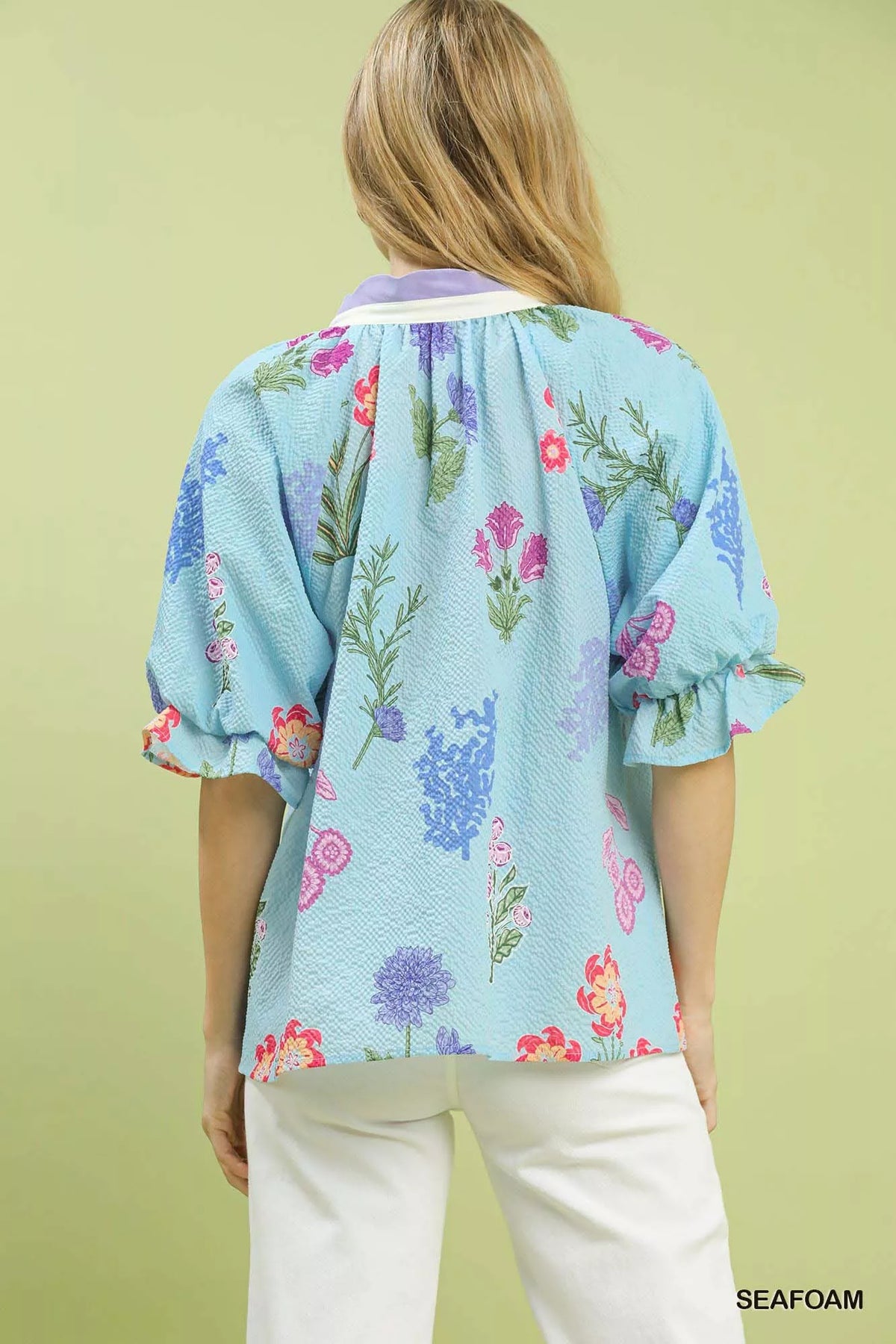 Umgee Floral Puff Sleeve Blouse with Scallop Trim Collar