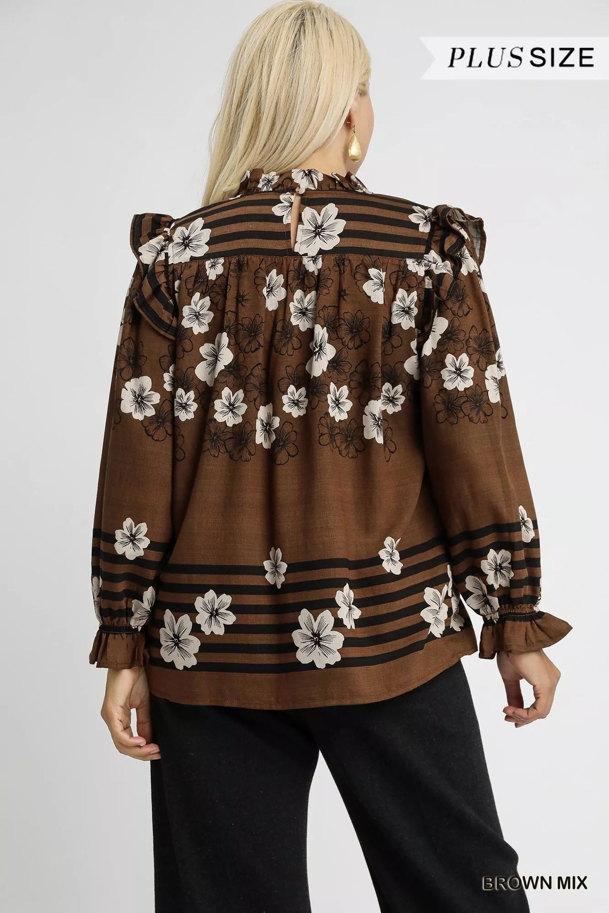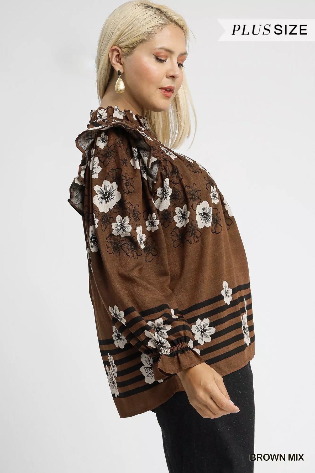 This mix floral smocked ruffle blouse is a charming addition to your wardrobe. The smocked detailing provides a comfortable and flattering fit. The ruffle accents add a touch of femininity and flair to the blouse. Pair it with jeans or a skirt for a stylish and romantic look.