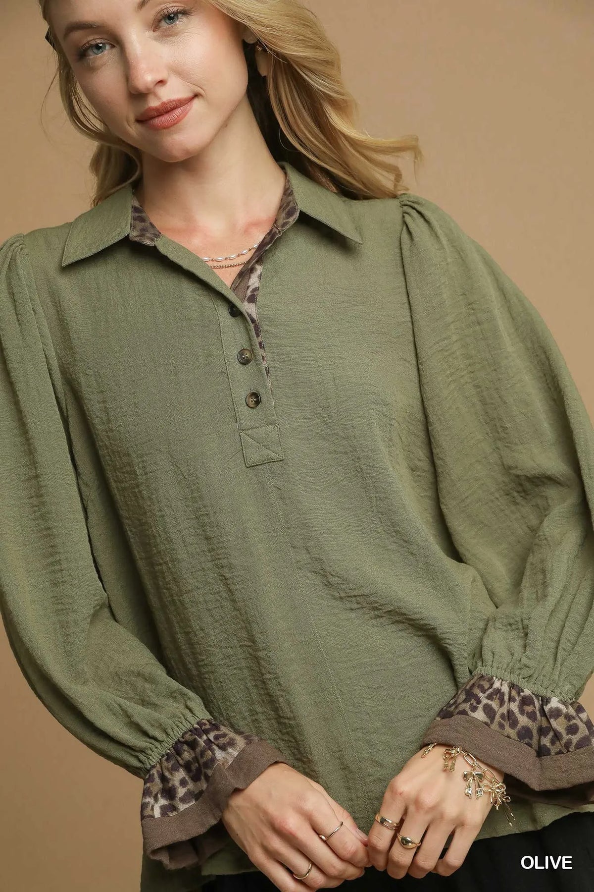 The Half Button Blouse with Leopard Print Trim is a trendy and eye-catching piece for your wardrobe. The leopard print trim adds a fun and playful touch to the classic design. Featuring a half-button front, this blouse offers a versatile and stylish look. Made from comfortable and lightweight fabric, it is perfect for all-day wear. Pair it with your favorite jeans or skirt for a fashionable ensemble.