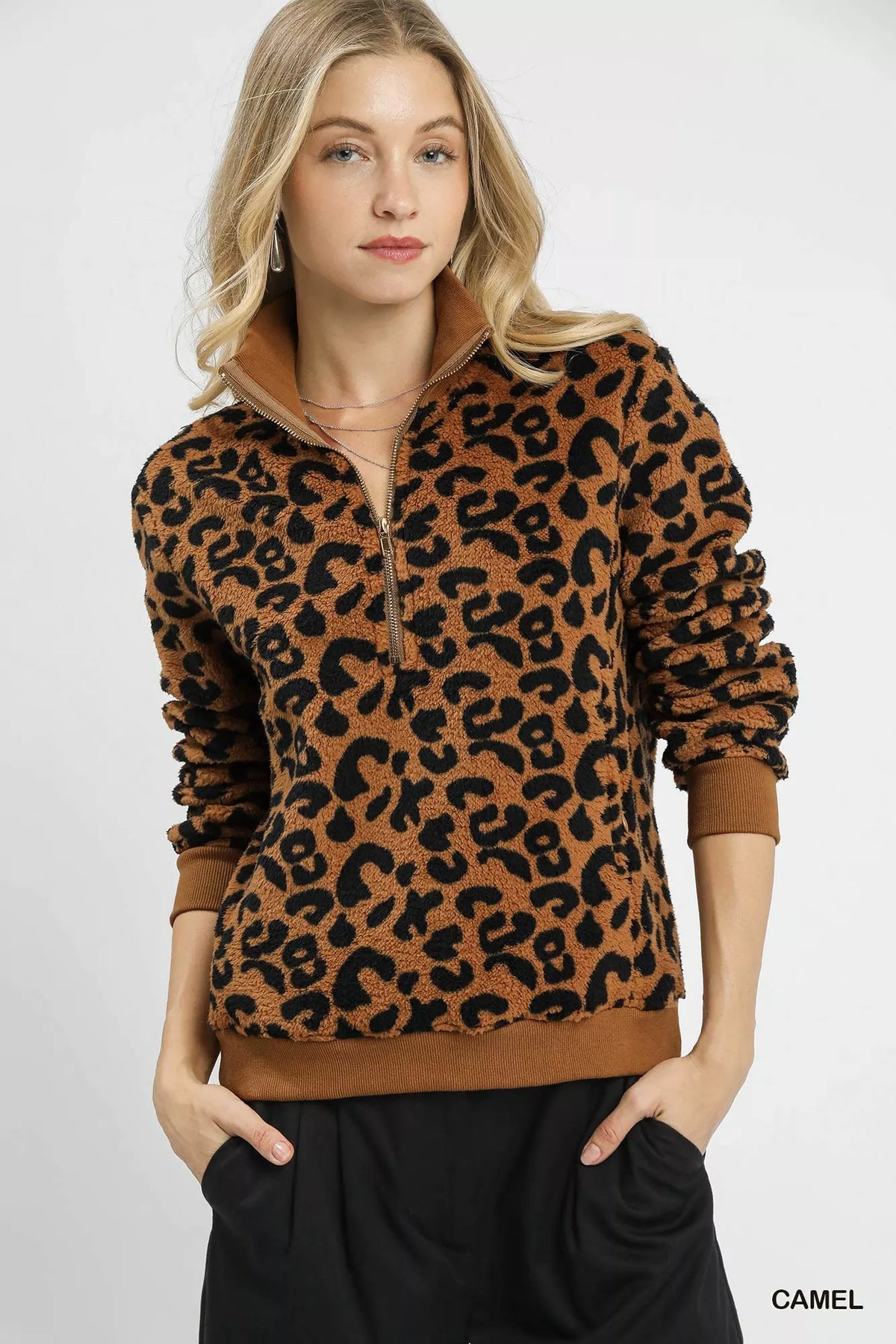 Umgee Leopard Print Quarter-Zip Sweatshirt