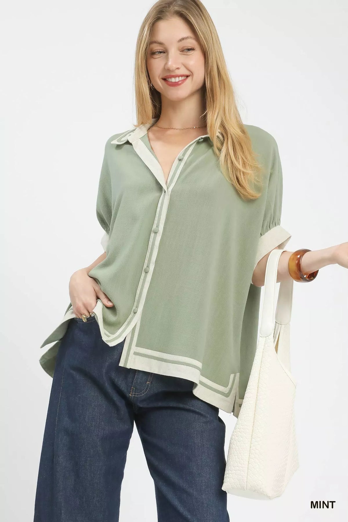 Umgee Linen Button Front Top with Contrast Piping