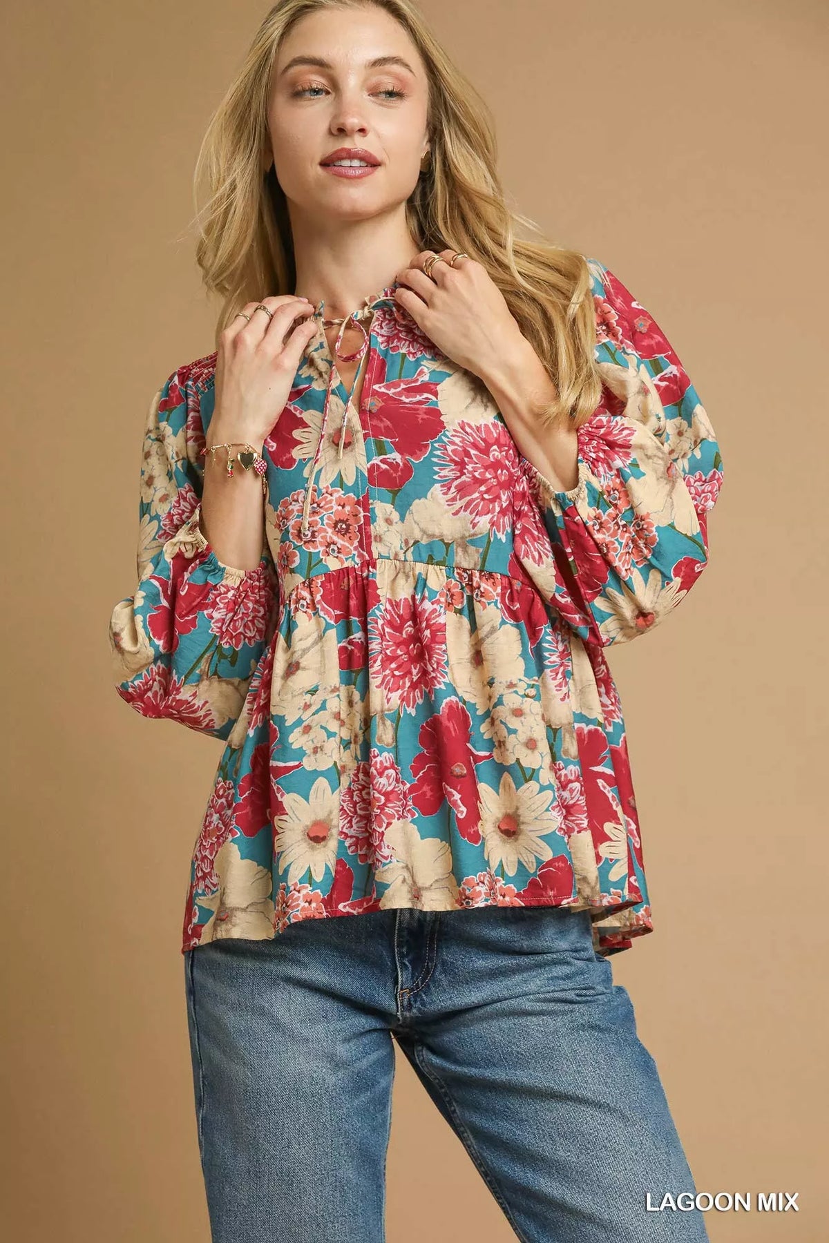 Umgee Mix Floral Peplum Blouse with Tie Neck