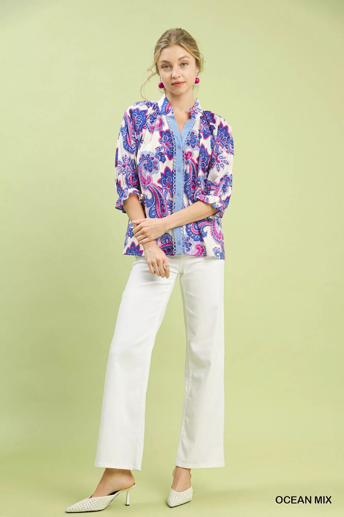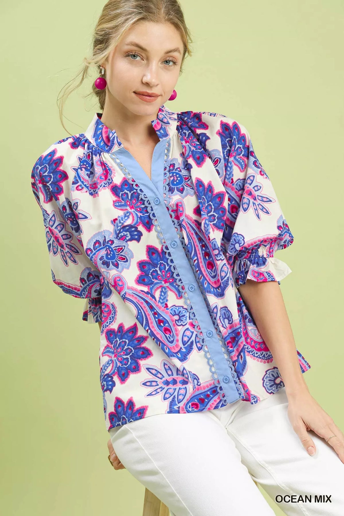 Umgee Paisley Print Button Front Blouse with Scallop Trim Detail