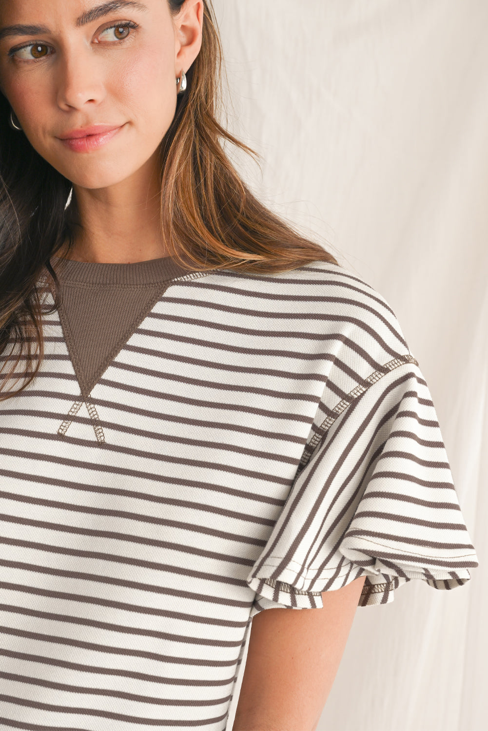 Parchment Striped Ruffle Sleeve Round Neck Top