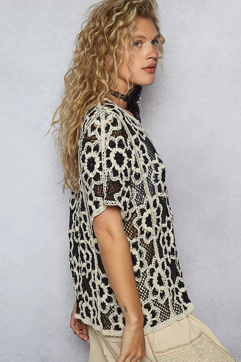 Elevate your summer wardrobe with this openwork short sleeve crochet knit top showcasing intricate weave knit patterns. The crochet details add a charming and bohemian flair to the top. The short sleeves provide a breezy and stylish look for warm days. Perfect for pairing with high-waisted bottoms for a trendy and feminine ensemble. Stay on-trend and effortlessly chic with this unique crochet knit top.