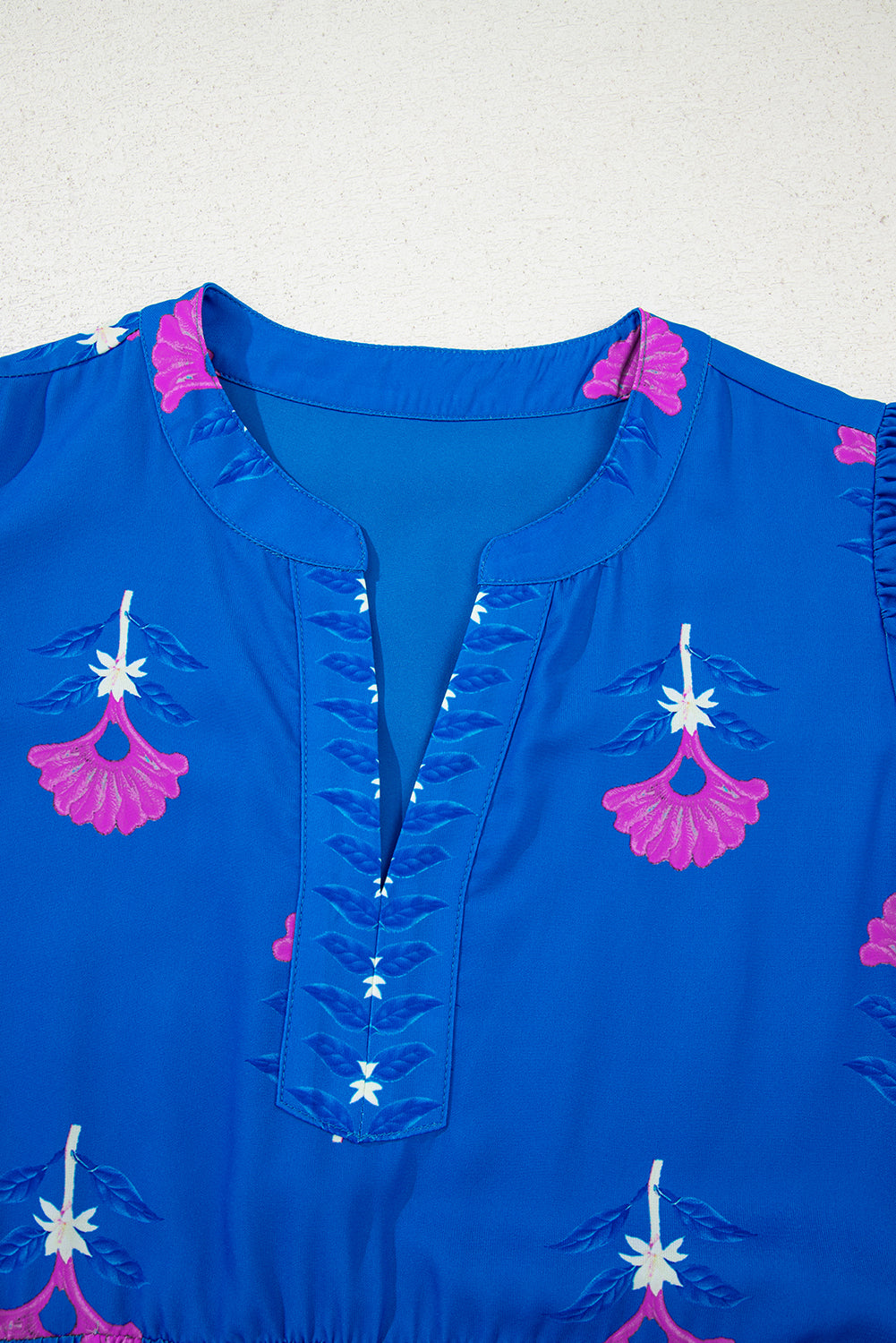 Blue Floral Print Notched Neck Butterfly Sleeve Shift Long Dress