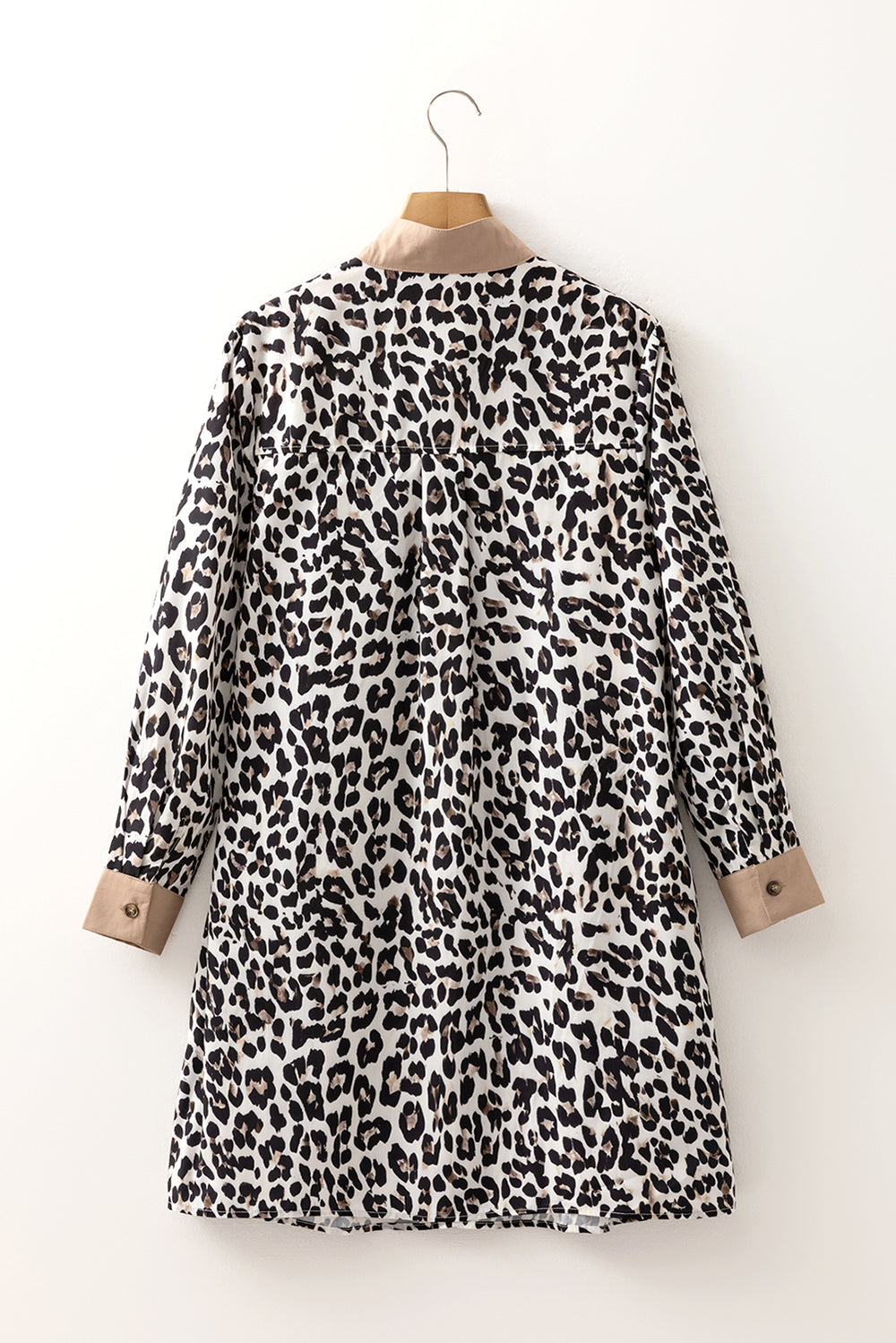 Multicolour Button Striped Collar Leopard Print Long Sleeve Flared Dress