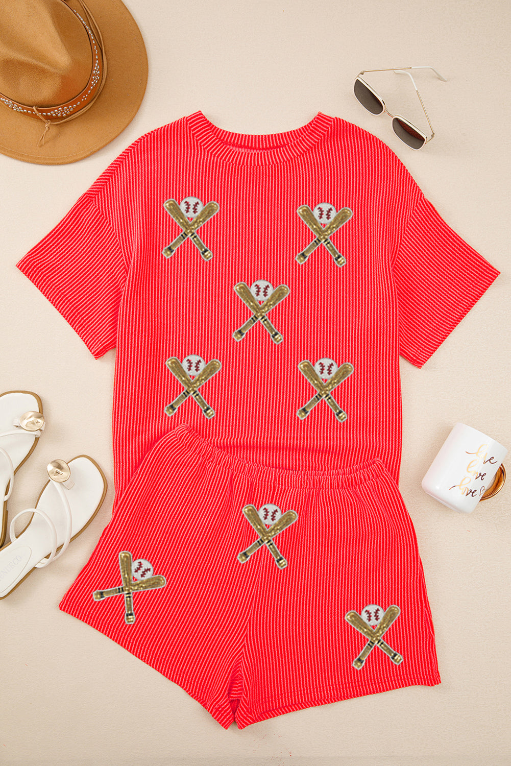 Orange Twisted Ribbed Sequin Baseball Patched 2pcs Short Set
