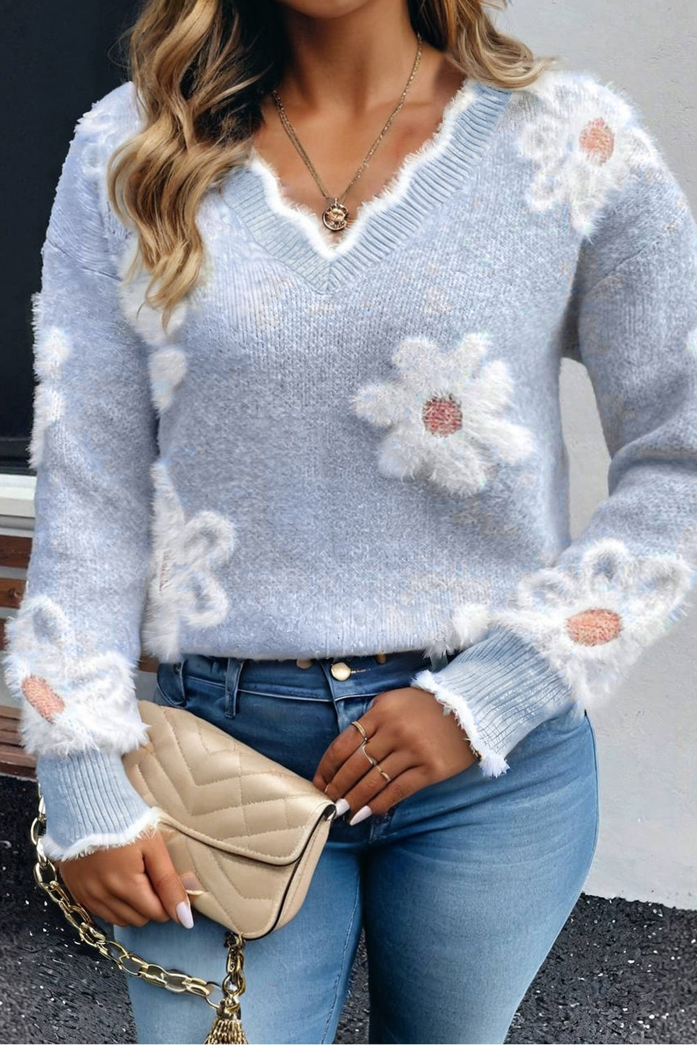 Gray Fuzzy Flower Scalloped V Neck Plus Sweater