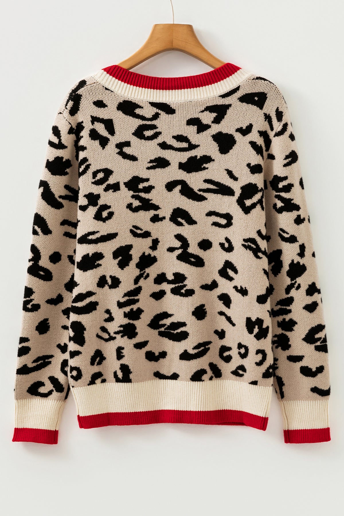 Khaki Leopard Pattern V-Neck Contrast Rib Knitted Sweater