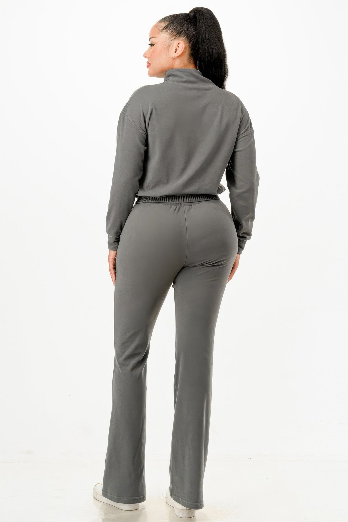 • Two-piece set includes zip-up top and flare pants