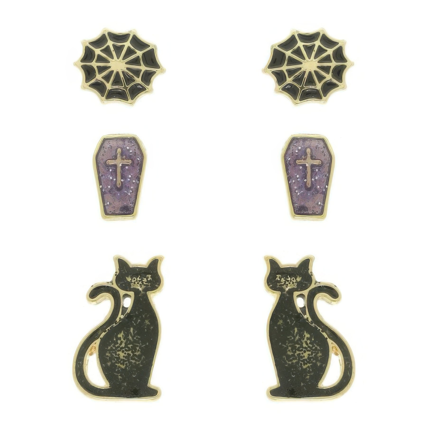 • Set includes 3 enamel post earrings: coffin, cat, and spiderweb