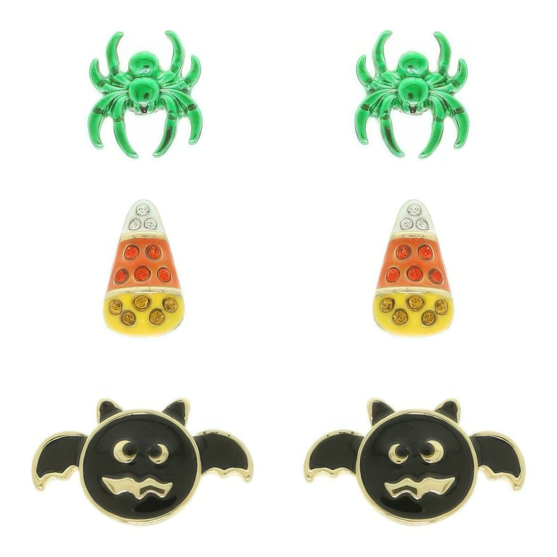 • Includes 3 post earrings: enamel bat, spider, and rhinestone candy corn