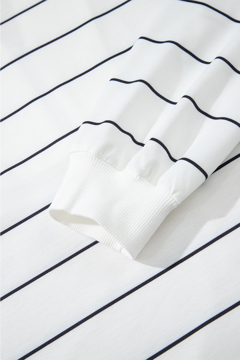 White Zip V Neck Casual Stripe Print Drop Shoulder Long Sleeve Top