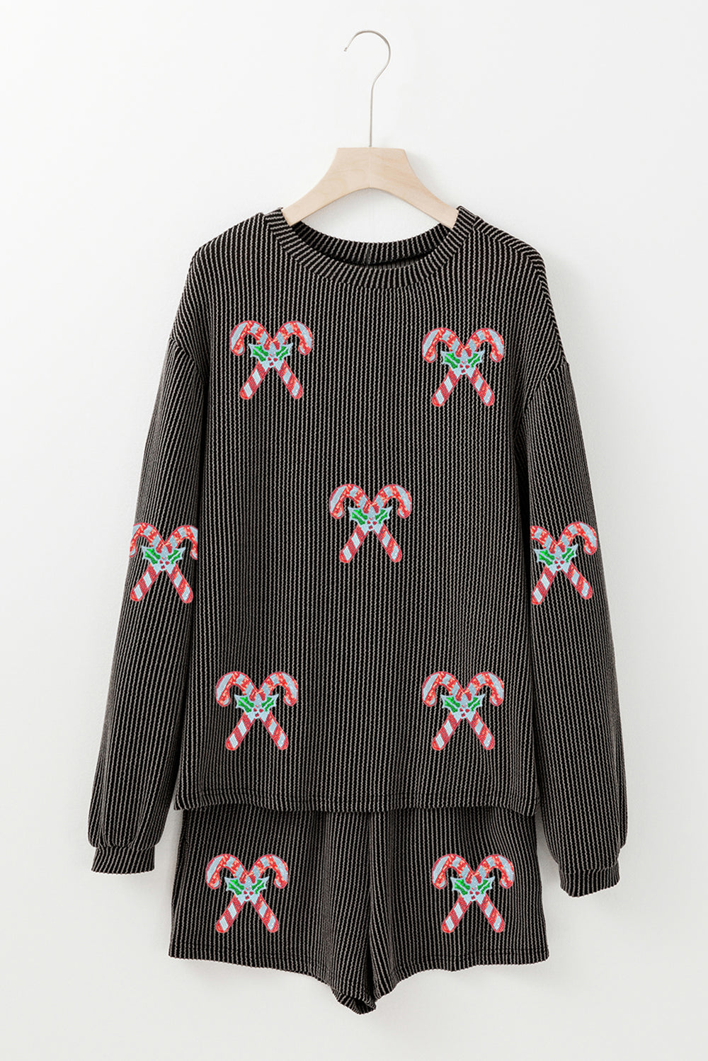Carbon Grey Twisted Ribbed Sequin Holly Candy Cane Long Sleeve Top and Shorts 2pcs Outfit