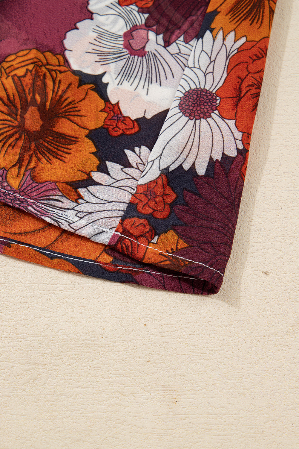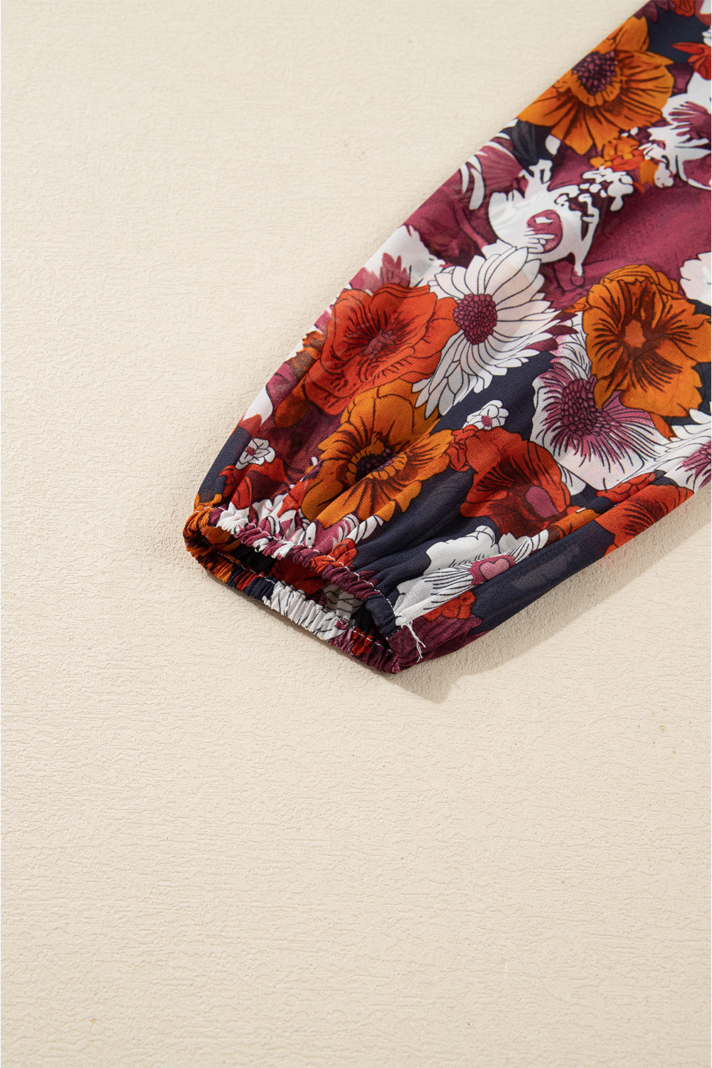 Red Floral Print Wrap V Neck Puff Sleeve Flowy Mini Dress