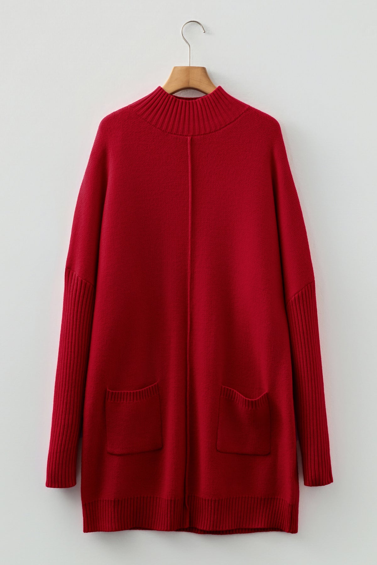 Ribbed knit high neck design keeps you cozy and stylish in cold weather. The shift fit silhouette offers comfort with a modern, effortless style. Front pockets and center seam detail add functional charm and chic structure. Versatile chic makes it easy to dress up with boots or sneakers.